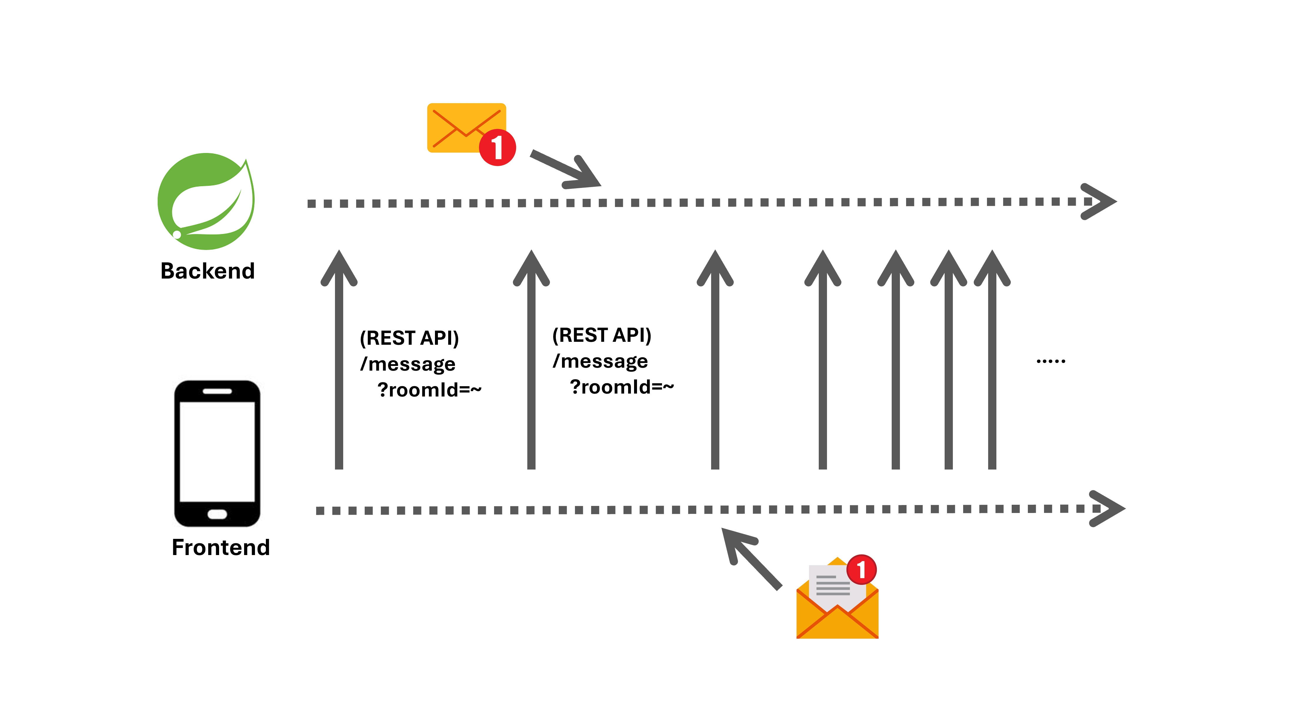 - 클라이언트가 새 메시지를 받으려면 폴링 또는 수동 새로고침 필요